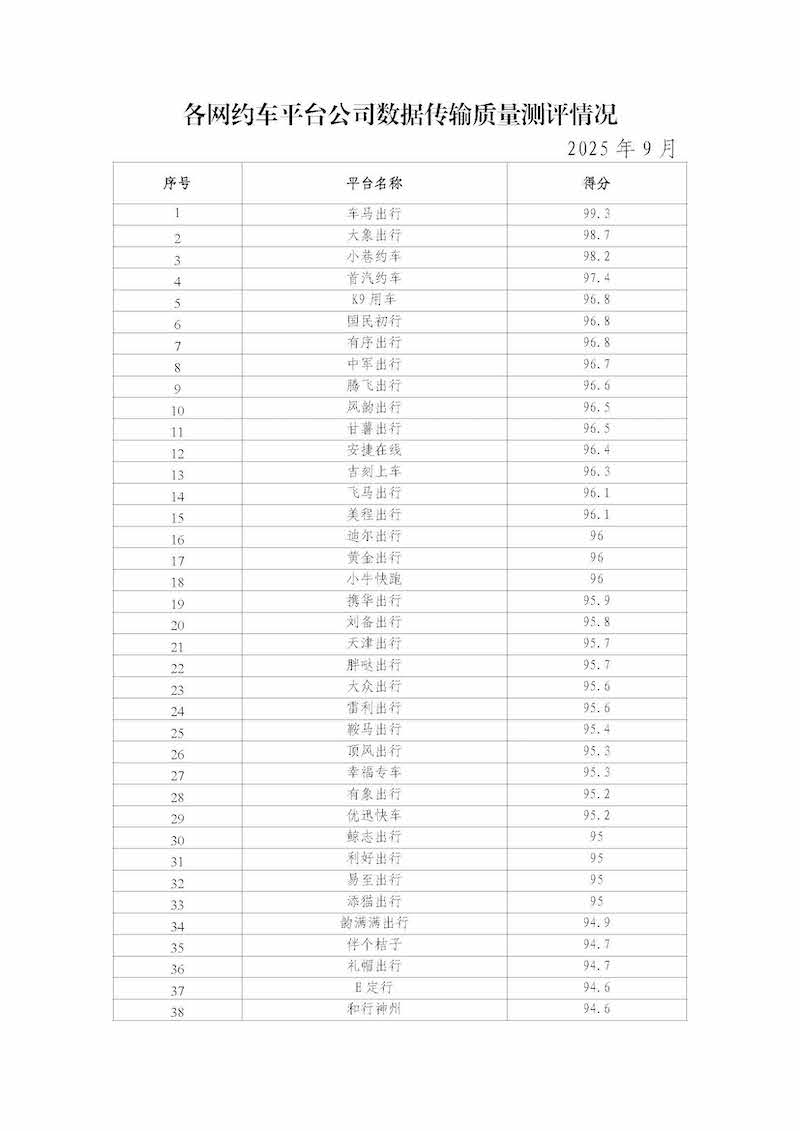 根據(jù)《交通運(yùn)輸部關(guān)于印發(fā)〈網(wǎng)絡(luò)預(yù)約出租汽車監(jiān)管信息交互平臺運(yùn)行管理辦法〉的通知》(交運(yùn)規(guī)〔2022〕1號)有關(guān)要求,網(wǎng)絡(luò)預(yù)約出租汽車監(jiān)管信息交互平臺對2025年9月網(wǎng)約車平臺公司數(shù)據(jù)傳輸質(zhì)量情況開展測評,結(jié)果如下: