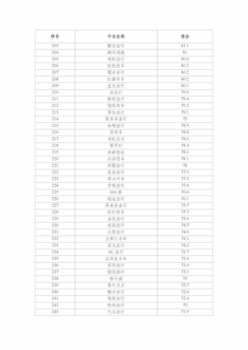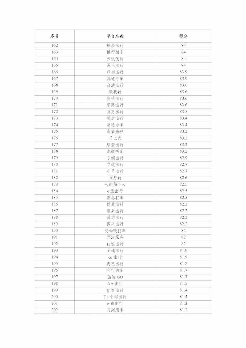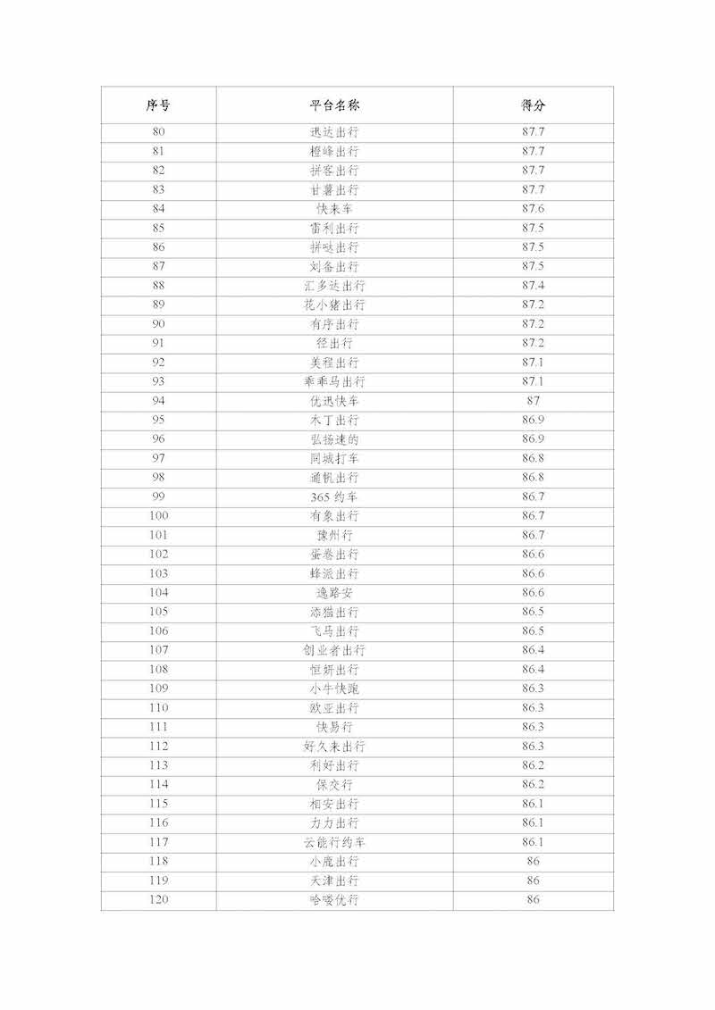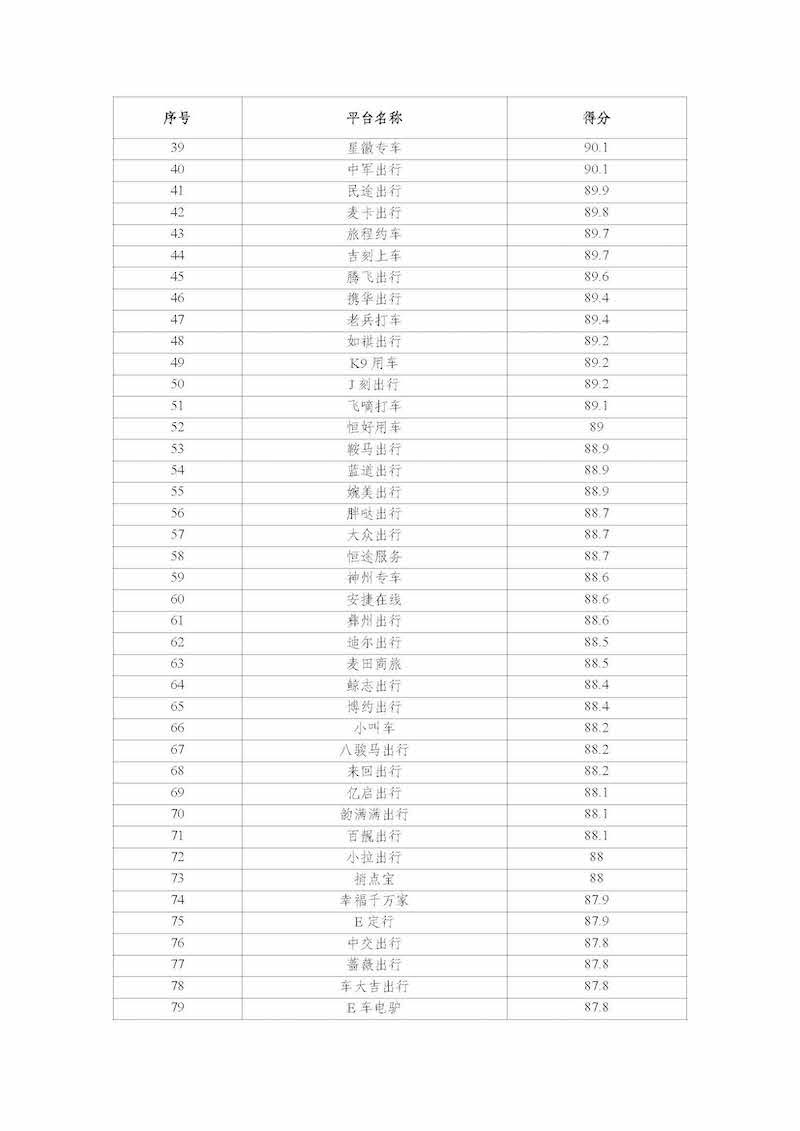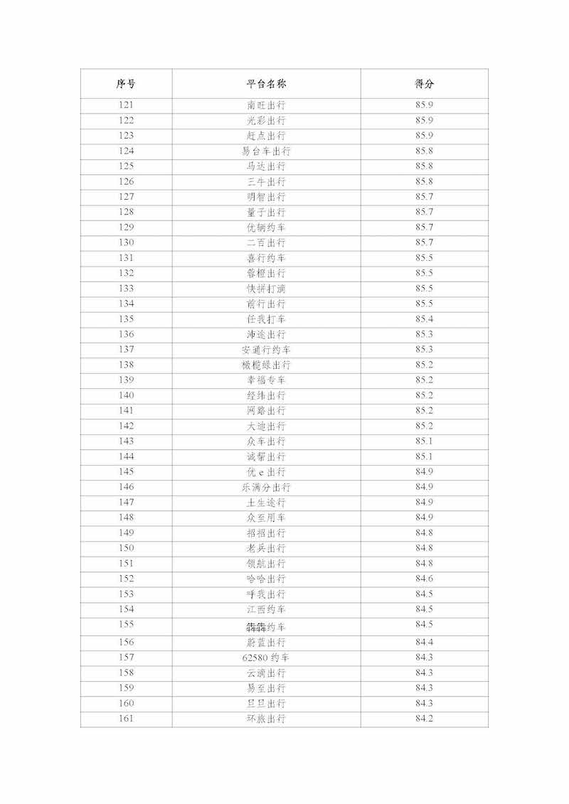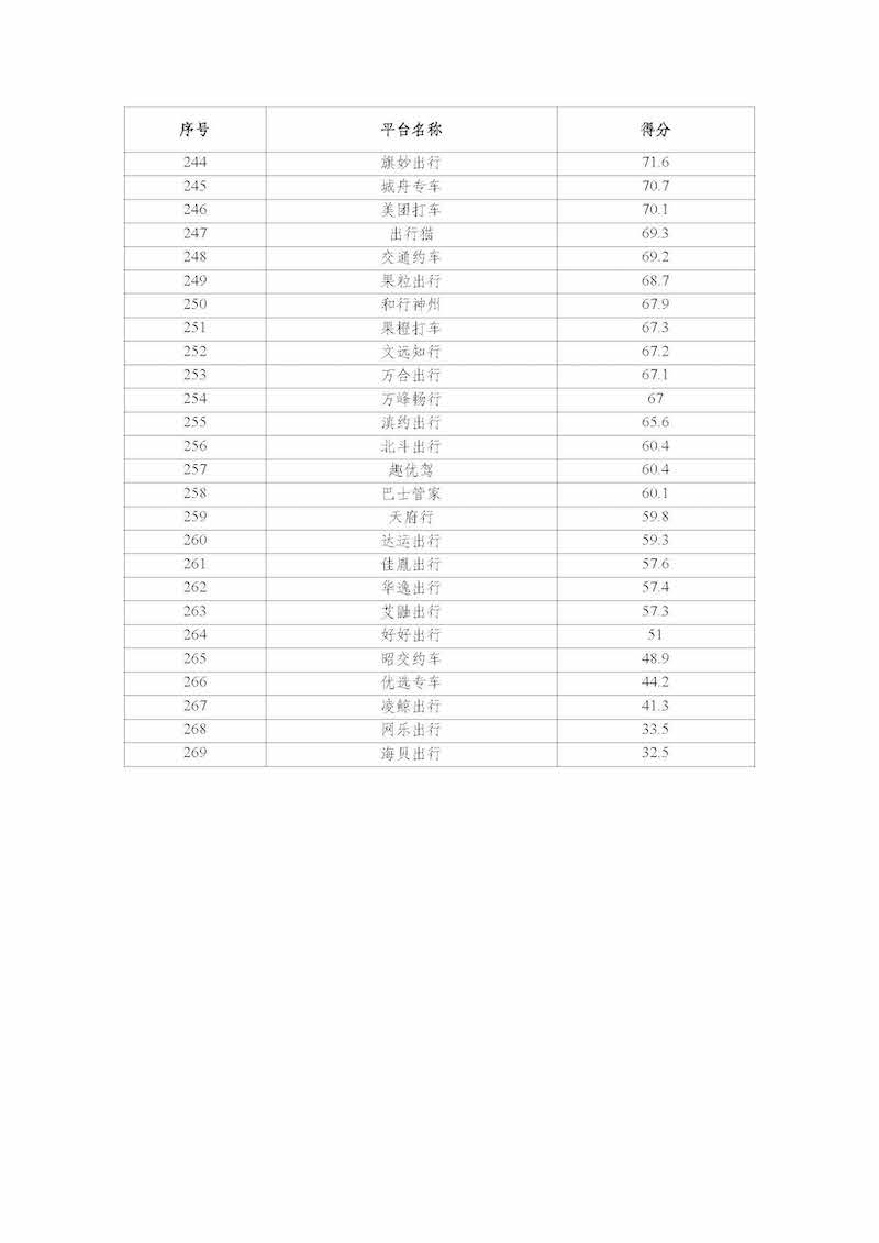 2025年11月,網(wǎng)絡(luò)預(yù)約出租汽車監(jiān)管信息交互平臺共收到269家網(wǎng)約車平臺公司傳輸?shù)臄?shù)據(jù),按數(shù)據(jù)完整性、規(guī)范性、及時性、真實性等指標(biāo)評分共100分計算,平均得分為87.2分,各網(wǎng)約車平臺公司數(shù)據(jù)傳輸質(zhì)量具體情況附后。