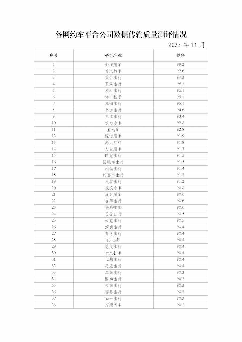 根據(jù)《交通運輸部關(guān)于印發(fā)〈網(wǎng)絡(luò)預(yù)約出租汽車監(jiān)管信息交互平臺運行管理辦法〉的通知》(交運規(guī)〔2022〕1號)有關(guān)要求,網(wǎng)絡(luò)預(yù)約出租汽車監(jiān)管信息交互平臺對2025年11月網(wǎng)約車平臺公司數(shù)據(jù)傳輸質(zhì)量情況開展測評,結(jié)果如下: